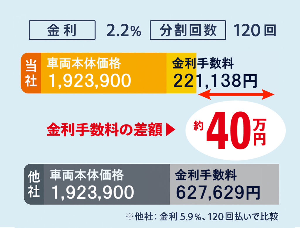 新車を無理なく購入してもらいたい」そんな思いから実現した低金利2.2%~のオートローン。クレジット会社にも協力してもらい、他社にはないような低い金利にすることができました。レジット会社の審査に通過する必要はありますが、低金利を利用するための条件などは設けておりません。低金利2.2%~、最長120回まで分割でお支払いいただけます。頭金、ボーナス額は自由に決めてOKです。分割で自動車を購入する人が増えているのに、今までの車屋さんは分割金利が5~6%程度ととても高いままでした。しかし、多くのお客様は金利の差だけで数十万円も差が出るということを知りません。分割時の金利手数料を抑えることで、あこがれの車や1ランク上のグレード、欲しかったオプションも無理なく付けることができます。新車のお店は、皆様の「新車に乗りたい」を応援します。